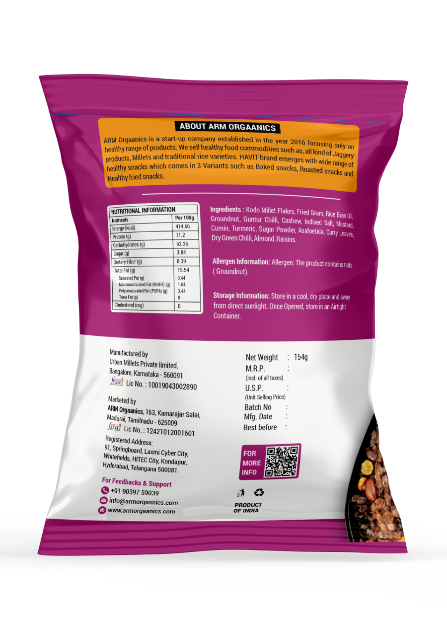 | Ingredients | Almonds, Asafoetida, Cashew, Cumin, Curry leaves, Dry green Chilli, Fried Gram, Iodised Salt, Kodo Millet Flakes, Mustard, Raisin, Rice Bran oil, Sugar Powder |