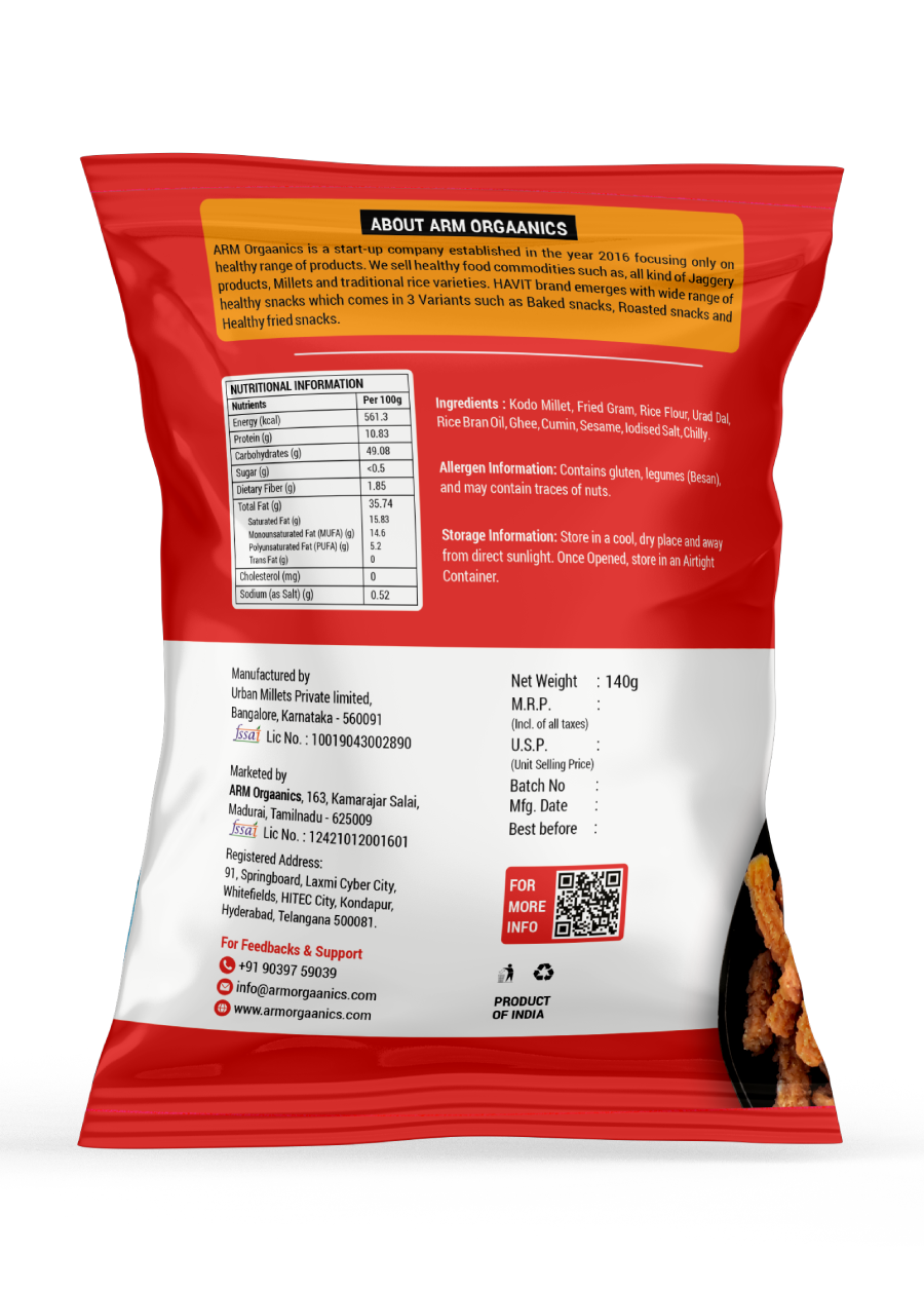 | Ingredients | chilly, Cumin, Fried Gram, Ghee, Iodised Salt, Kodo Millet, Rice Bran oil, Rice Flour, Seasme, Urad Dal |