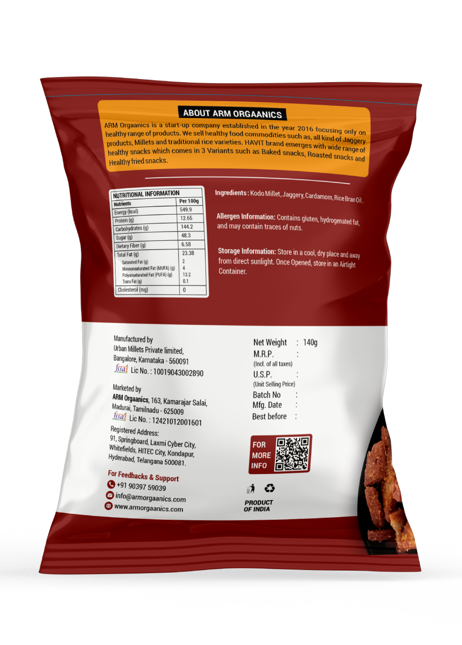 | Ingredients | Cardamom, Jaggery, Kodo Millet, Rice Bran oil |