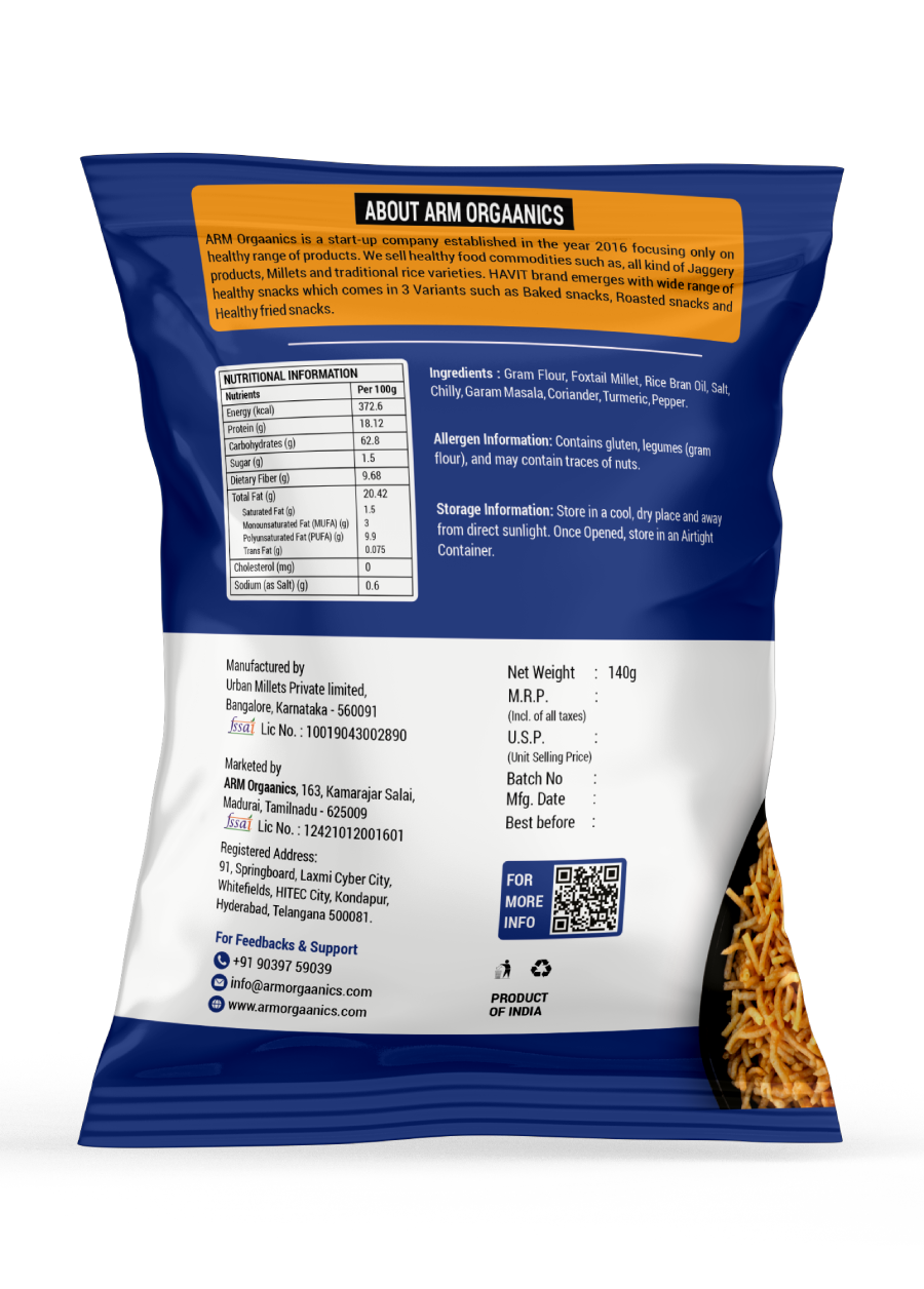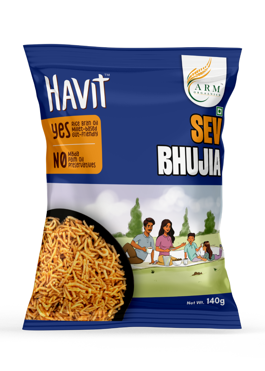 Say hello to your favorite crunchy snack — made smarter. Havit Millet Sev Bhujia blends the timeless taste of Indian bhujia with the goodness of foxtail millet and gram flour, all fried in Rice Bran Oil for a lighter, gut-friendly crunch.